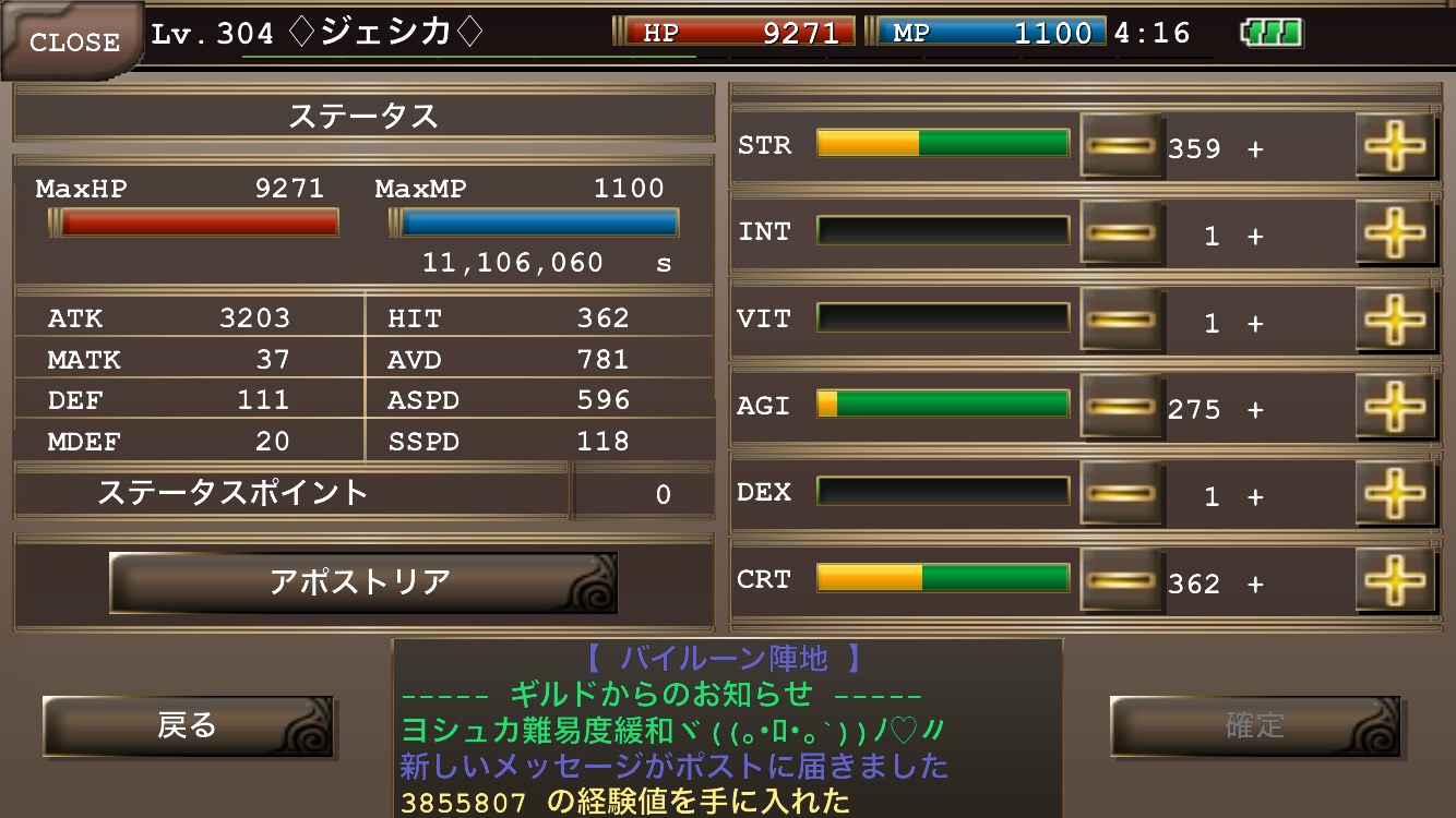 自分の場合はS=C>Aに降っています。先程も言いましたが、グラディエーターはクリティカル依存でダメージが反映されるのでC優先でAは275が剣の最速スピードになりますのできちんとふっておきましよう。