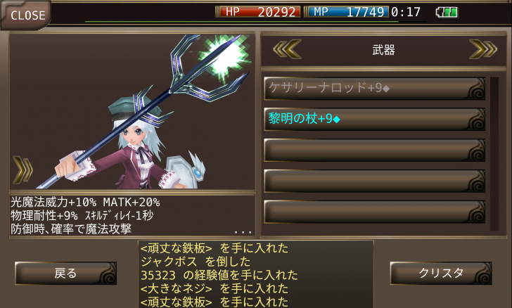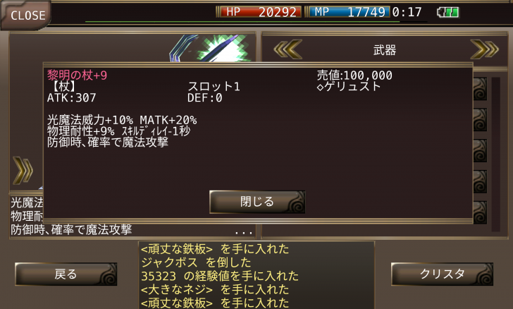 今回用意したのは+9と最高値のATK307の黎明の杖です。挿しているクリスタは「ゲリュスト」です。