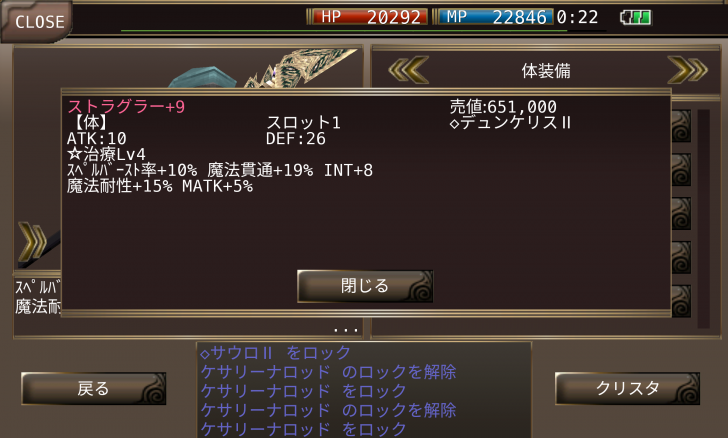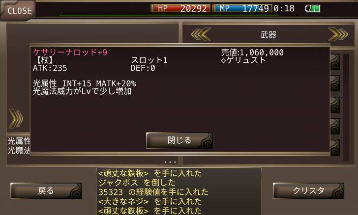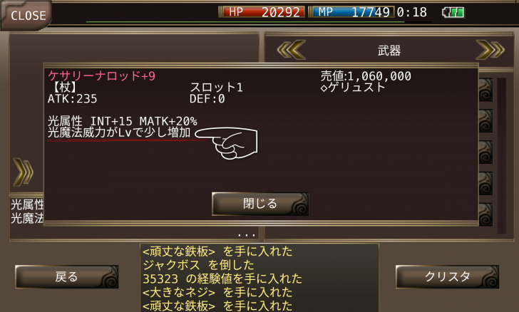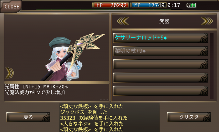 ケサリーナロッドのプロパティにある「光魔法威力がLvで少し増加」が今回の勝利の鍵となったのでしょうか。