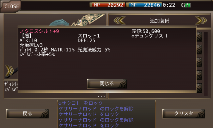 プロパティは光魔法威力+10% MATK+20% 物理耐性+9% スキルディレイ-1秒 防御時、確率で魔法攻撃という何やらと万能で便利なプロパティを持っています。